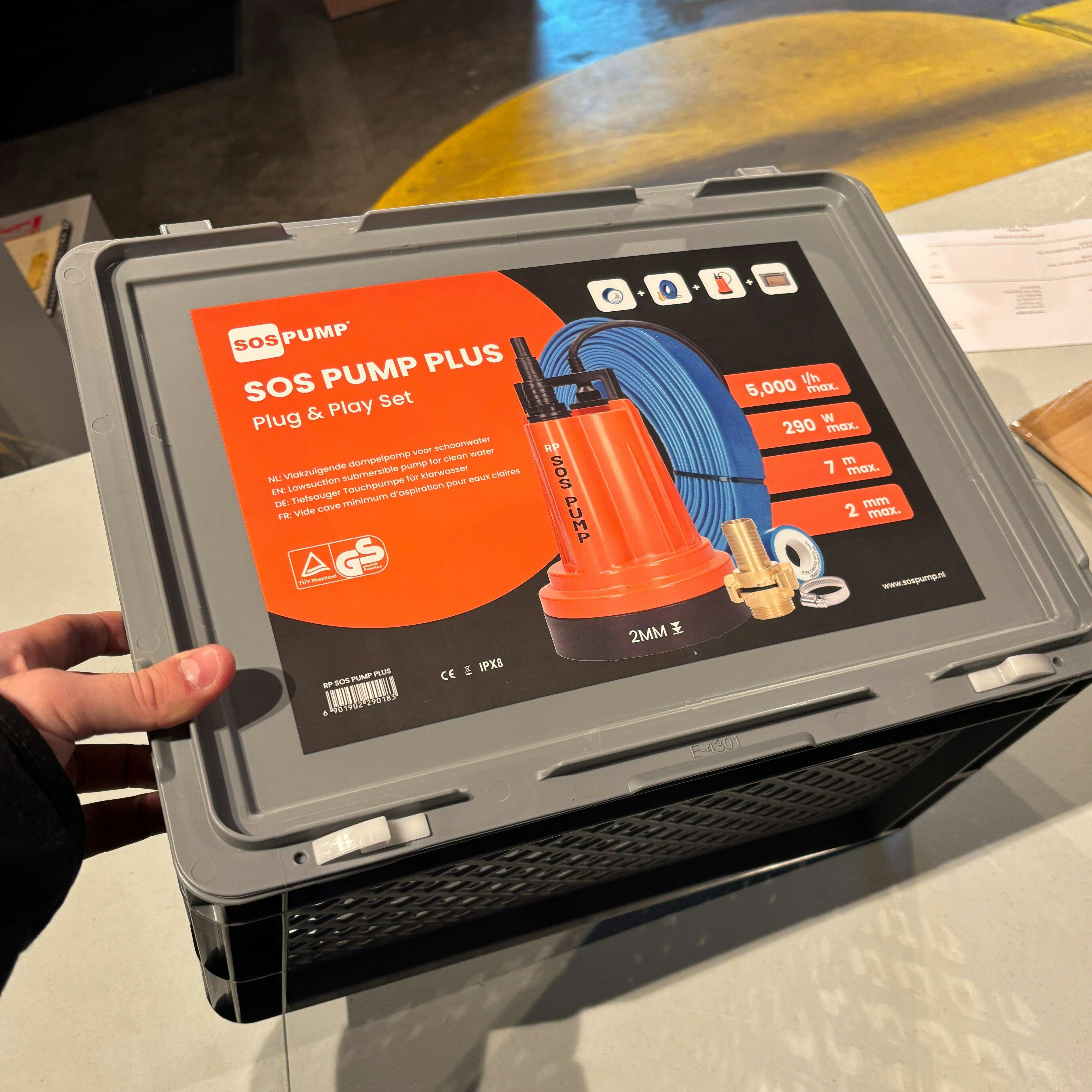 De SOS PUMP ® Plug & Play Dompelpomp Set is dé oplossing voor het leegpompen van kelders, daken, putten en meer. Deze krachtige dompelpomp set met vlakzuigende werking tot slechts 2 mm restwater verwerkt tot 5.000 liter per uur en houdt elke ruimte dweildroog. De vlakzuiger dompelpomp heeft een robuuste aluminium behuizing, oliegekoelde motor, luchtuitlaatventiel en werkt zonder vlotter. Inclusief 12,5 meter afvoerslang, messing snelkoppelingen, opbergbox, terugslagklep, slangtule en versmallingsstuk – alles wat je nodig hebt, direct klaar voor gebruik.